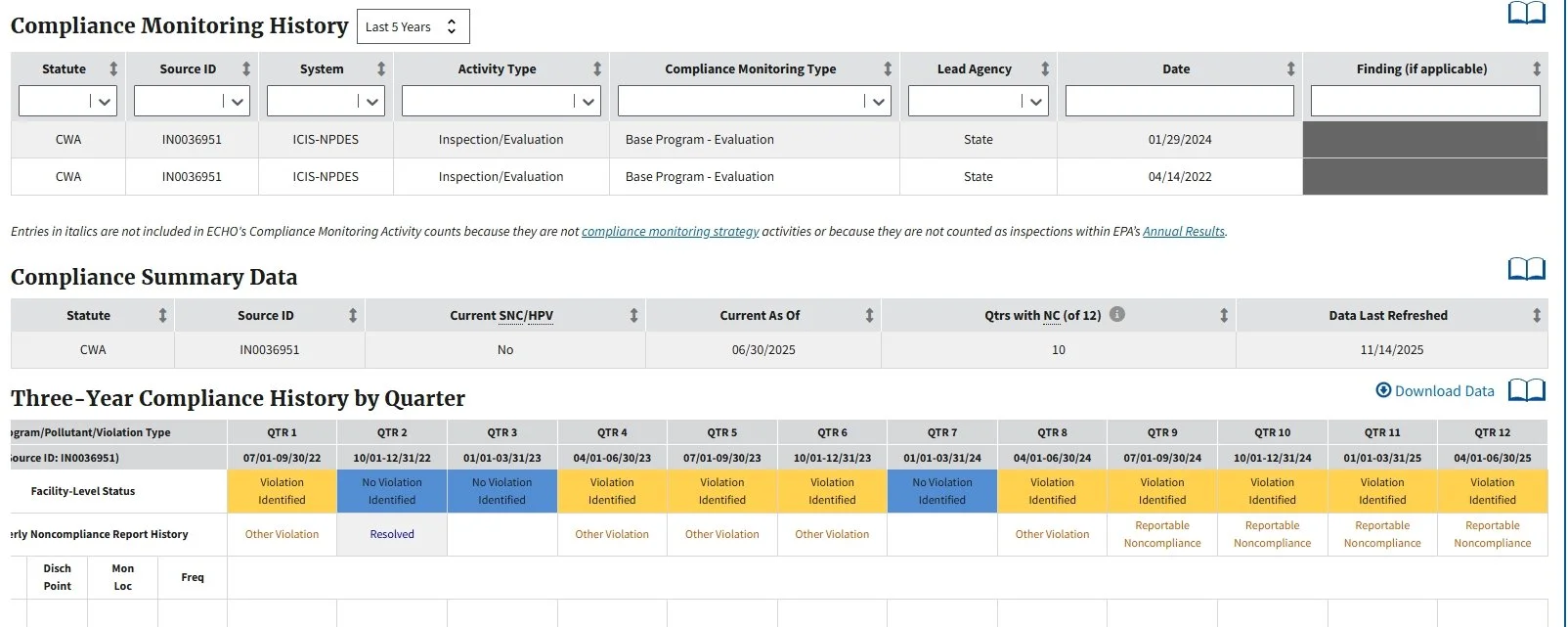 Zionsville WWTP 3 year Compliance Summary - from EPA.gov